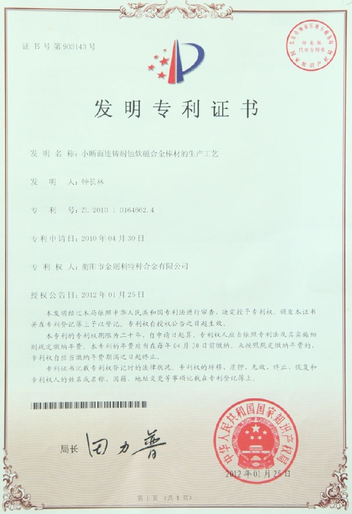 衡陽市金則利特種合金股份有限公司成立于一九九九年十二月,注冊資本人民幣兩千兩百萬元。注冊地址:衡陽市雁峰區白沙洲工業園長塘路2號。公司主營耐蝕軟磁合金,為湖南省高新技術企業。公司自成立以來,即致力于耐蝕軟磁合金的研發。 研制出的JL-31(00Cr13si2Pb)、JL-31B(00Cr13si2)、JL-31BS(00Cr13Si2S)、JL-37B(0Cr17Si2)、JL-37(0Cr17···
